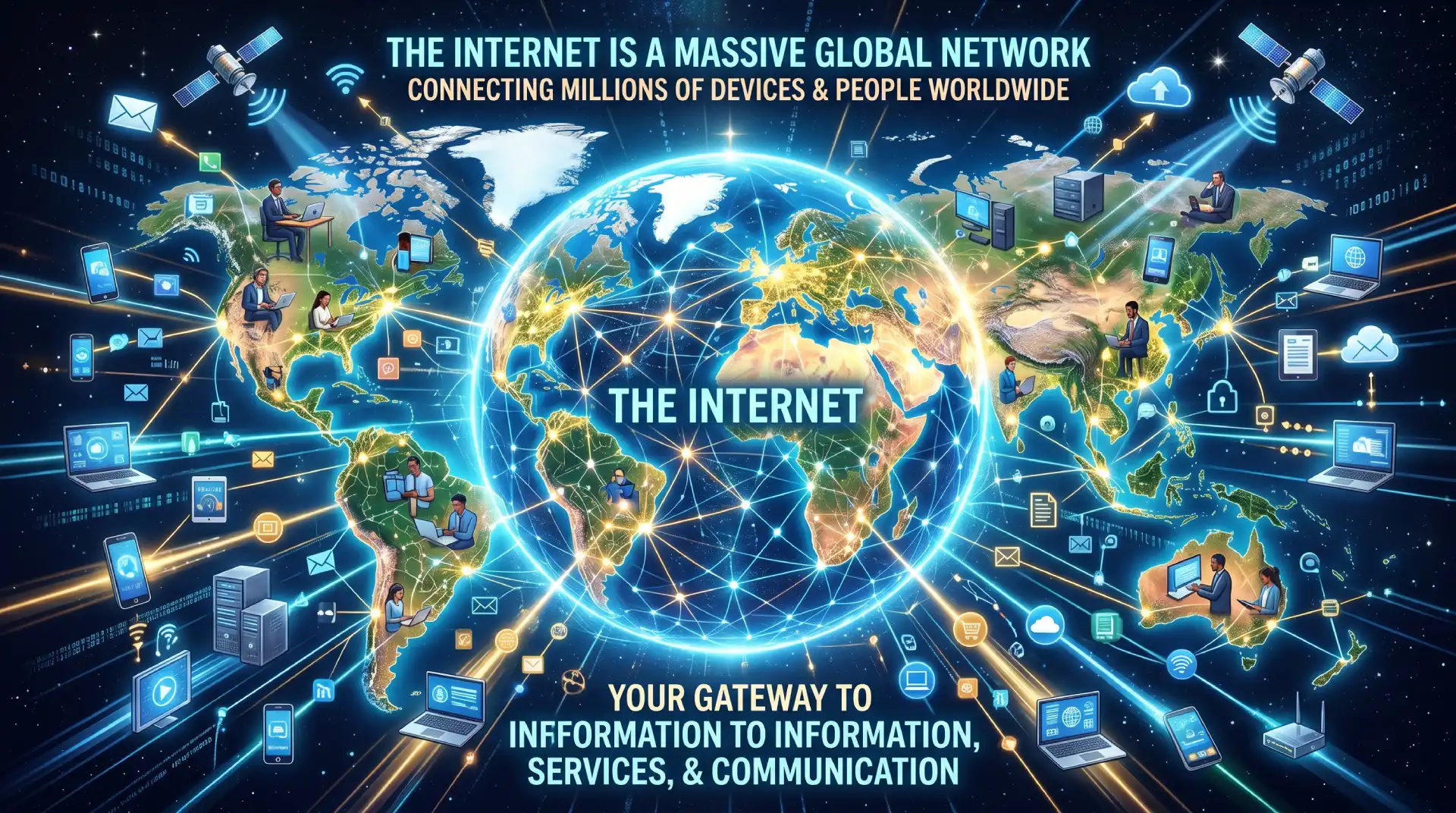 1.1 What is the internet The internet is a massive global network that connects millions of computers and devices to each other. Think of it like a giant invisible web that links people, businesses, and information all around the world. When you go online, you are connecting to this network and gaining access to an enormous amount of information, services, and communication tools.