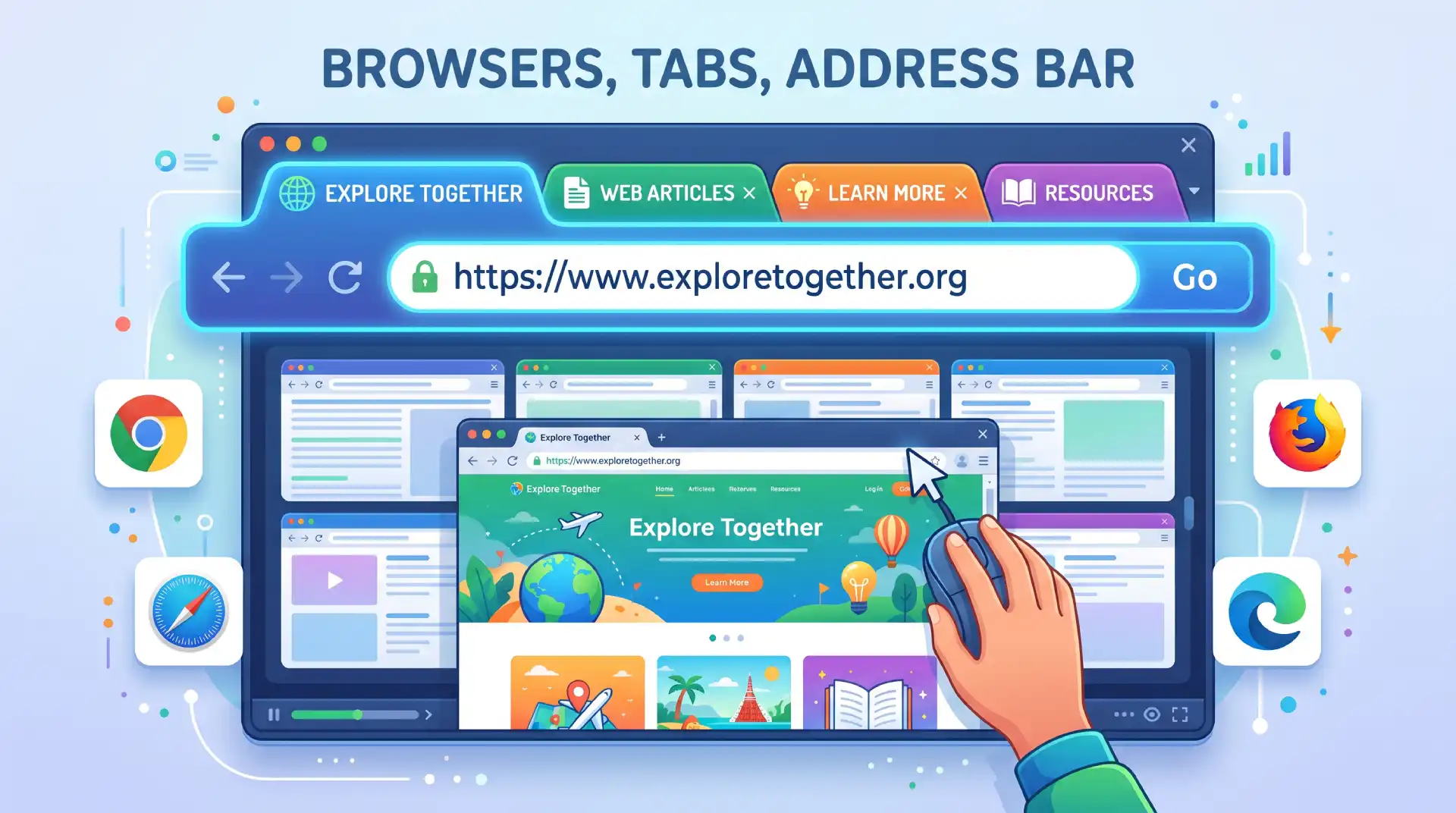 1.3 Browsers, tabs, address bar A browser is the application you use to access and view websites — examples include Google Chrome, Safari, Firefox, and Microsoft Edge. At the top of your browser you will find the address bar, where you type in a web address to visit a site. Tabs allow you to have multiple websites open at the same time without opening a separate window for each one.