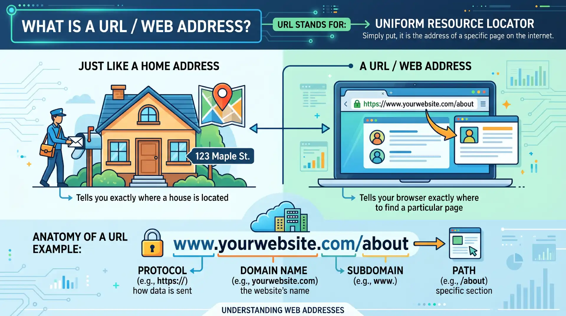 1.4 What is a URL / web address URL stands for Uniform Resource Locator, but simply put it is the address of a specific page on the internet. Just like a home address tells you exactly where a house is located, a URL tells your browser exactly where to find a particular page. An example would be www.yourwebsite.com/about, where each part of that address has a specific meaning.