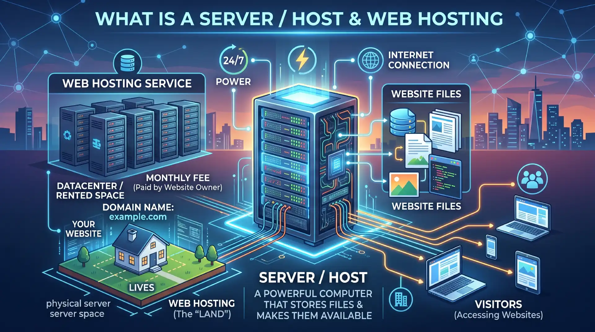 1.6 What is a server / host A server is essentially a powerful computer that is always switched on and connected to the internet, and its job is to store your website files and make them available to anyone who visits. Web hosting is the service you pay for to rent space on one of these servers. Think of it like renting a plot of land — your domain is the address, and the hosting is the actual land where your website lives.