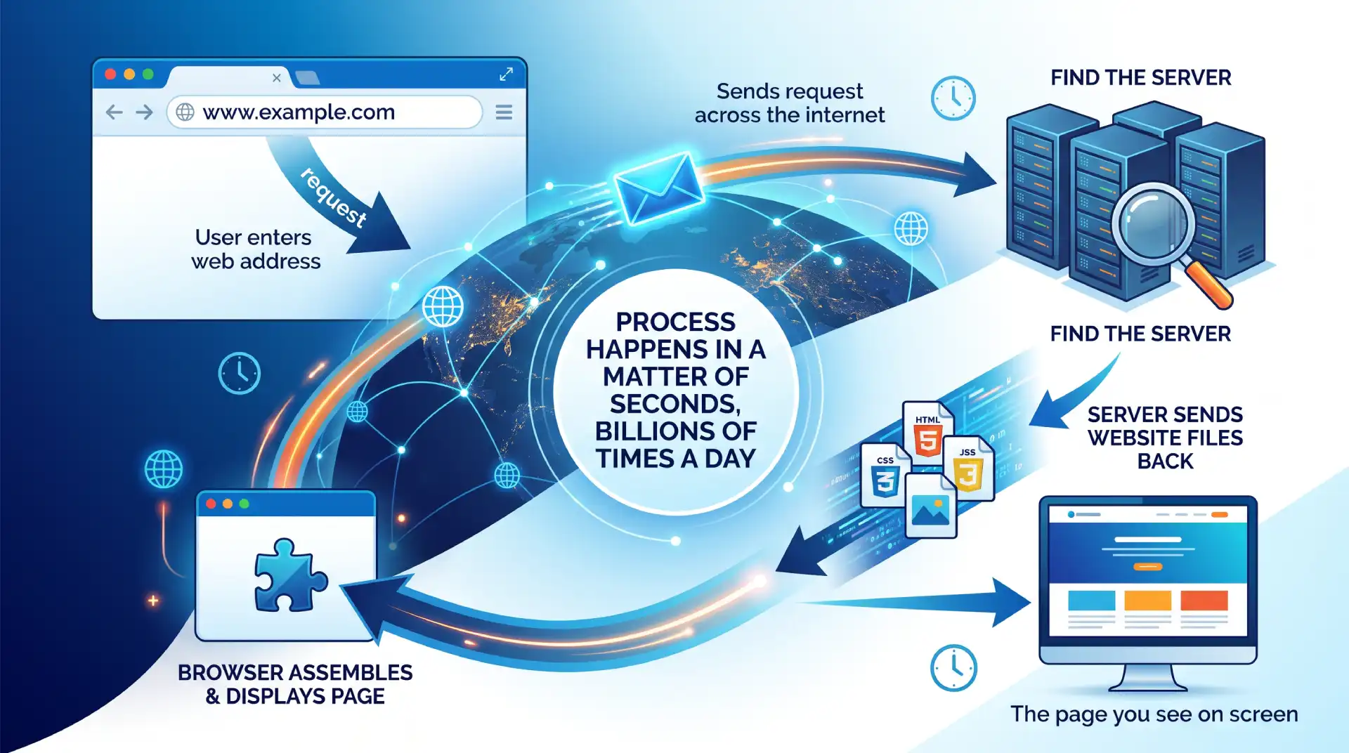 1.7 How a browser finds and loads a website When you type a web address into your browser, it sends a request across the internet to find the server where that website is stored. The server then sends the website files back to your browser, which assembles and displays them as the page you see on screen. This entire process happens in a matter of seconds, and it is happening billions of times a day all around the world.