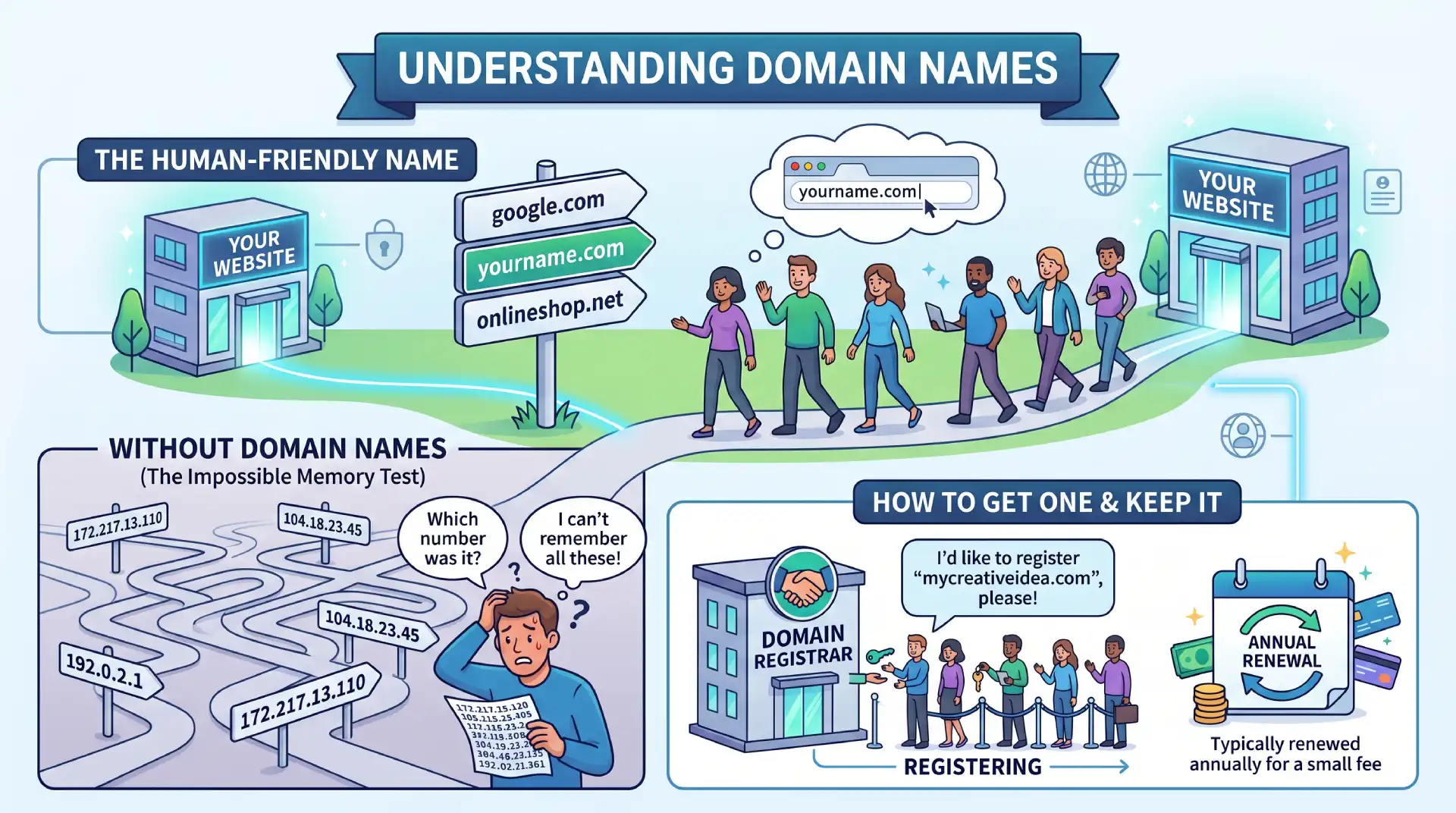 1.5 Domain names A domain name is the human-friendly name of a website, such as google.com or yourname.com. Without domain names, you would have to remember a string of numbers to visit any website, which would be impossible for most people. You register a domain name through a domain registrar, and it is typically renewed annually for a small fee.